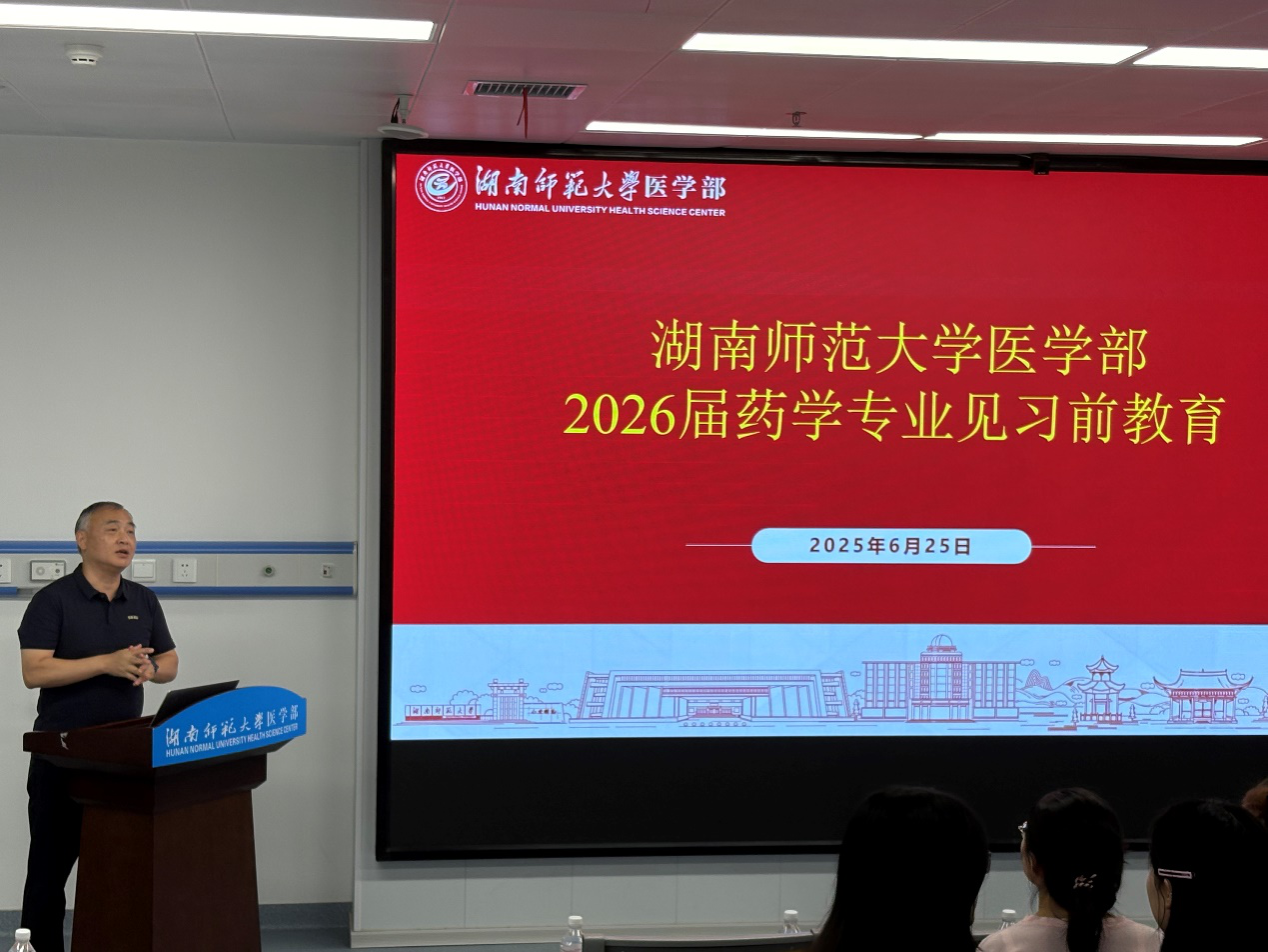 6月25日下午,药学院在综合楼312教室举行2026届药学专业见习前教育。会议由药学院副院长冯星主持,药学院部分带教老师参会。冯星首先向同学们介绍了暑期见习的计划安排和见习单位等信息,强调了见习的重要性以及对就业和升学的有益帮助,希望同学们积极把握去医院学习和实践的机会,在见习过程中还要保证安全、规范秩序,严格遵守学校以及见习单位的相关规定和操作规程。长沙市第三医院药学部郭思维副主任以“走进医院药学:从...