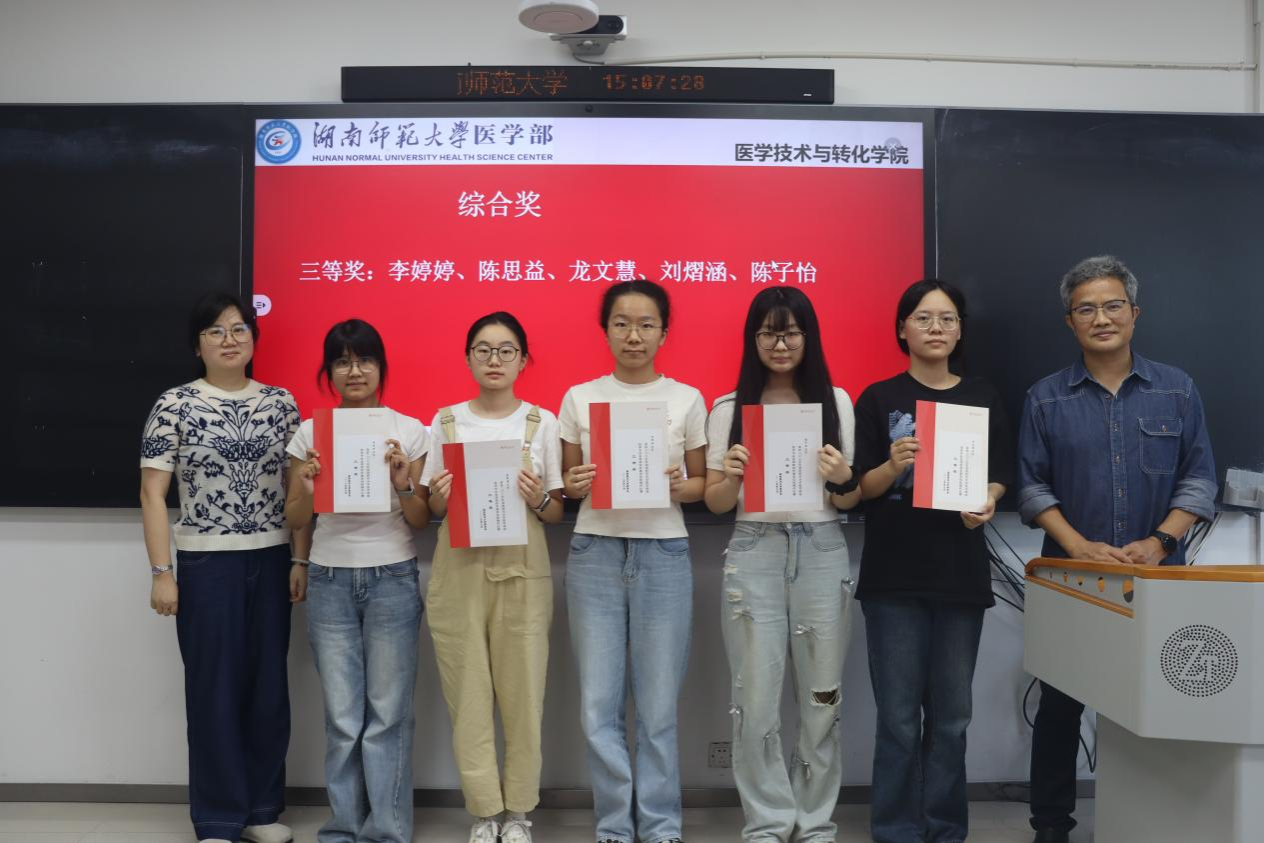 赛后于综合楼201教室举行了颁奖仪式。此次比赛共评选出综合奖9人,单项奖5人。医学部党工委副书记鄢朝晖、医学技术与转化学院副院长叶湘漓、检验系老师为获奖选手颁奖。